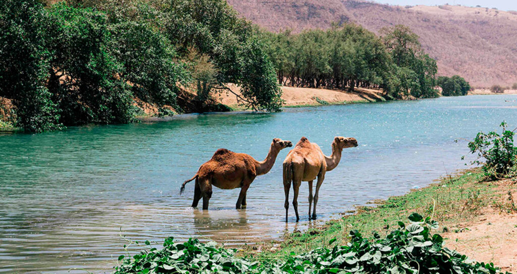 À quelques minutes à pied des ruines de Sumhuram se trouve le paisible Khor Rori, le plus attrayant des nombreux khors (ruisseaux) qui bordent le littoral autour de Salalah. Une paire de promontoires symétriques flanquent l'embouchure du khor, qui est séparé de la mer par un banc de sable bas. Par conséquent, les eaux à l'intérieur du ruisseau (alimenté par Wadi Darbat) sont d'eau douce et regorgent de poissons, qui à leur tour attirent une belle sélection d'oiseaux aquatiques, tandis que les chameaux peuvent généralement être vus brouter la verdure environnante. C'est un endroit merveilleusement paisible - si calme que vous pouvez réellement entendre les éclaboussures des poissons dans l'eau.